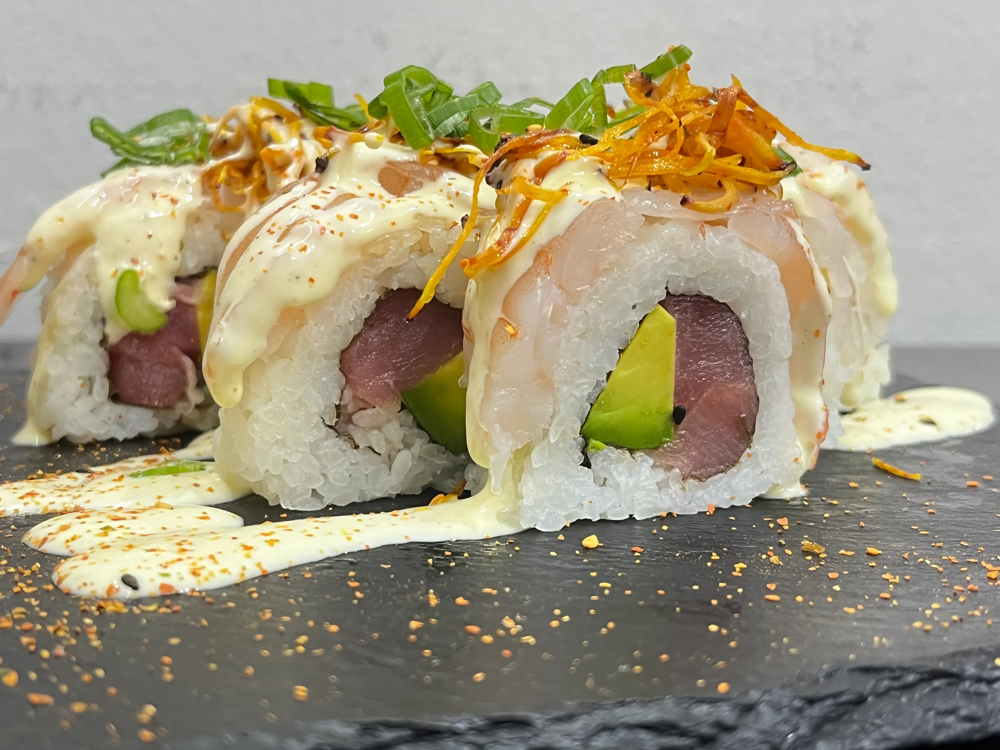 Camarón tempura, palta envuelto en arroz, coronado con pulpo, salsa olivo y cebollín.